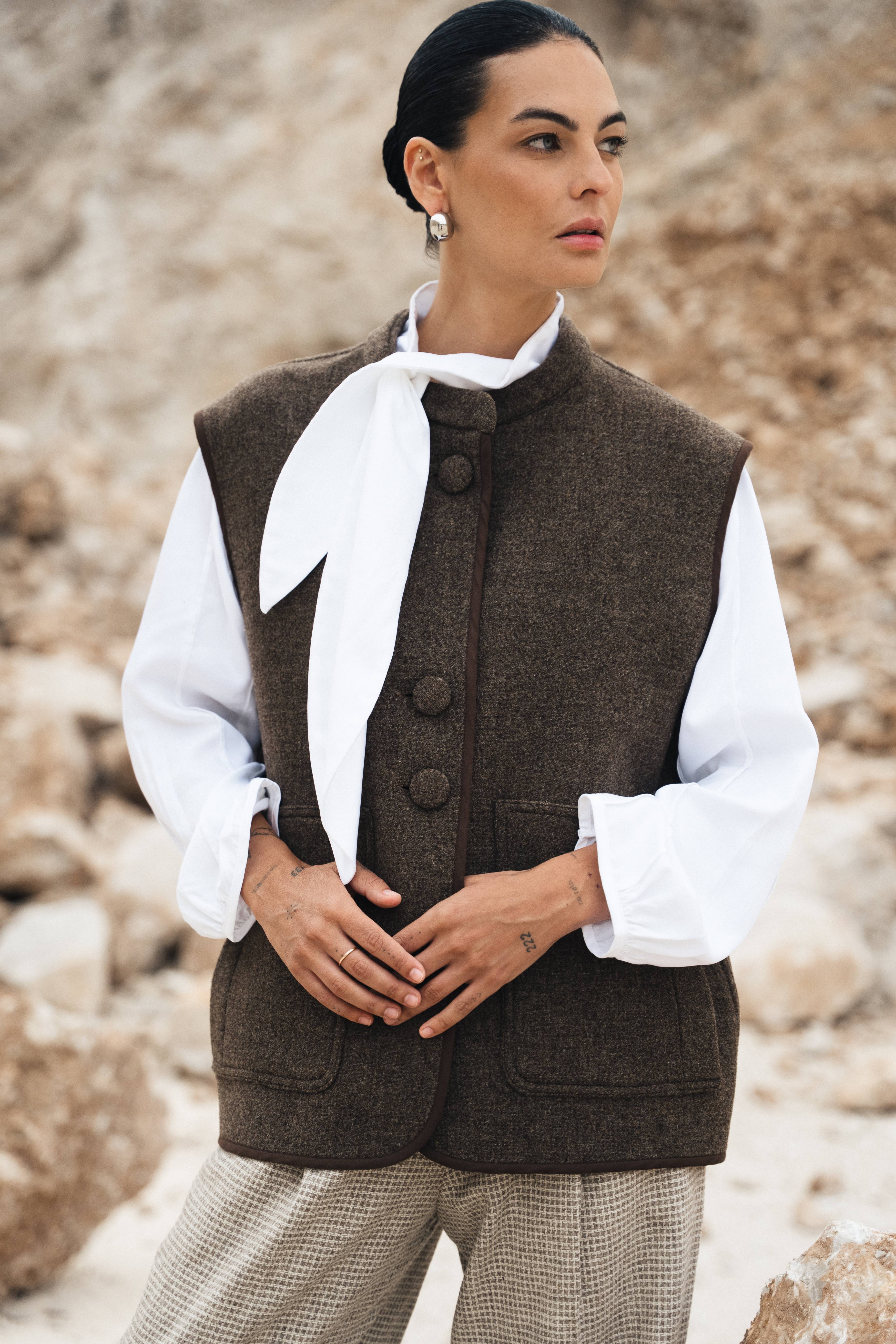 Apesar de ser um colete, o tecido escolhido foi a lã, o que oferece uma opção mais espessa, mas fofa, para quando os dias arrefecem. Além disso, poderá encontrá-lo na cor da estação, o castanho, que além de versátil, é uma das tendências deste ano.